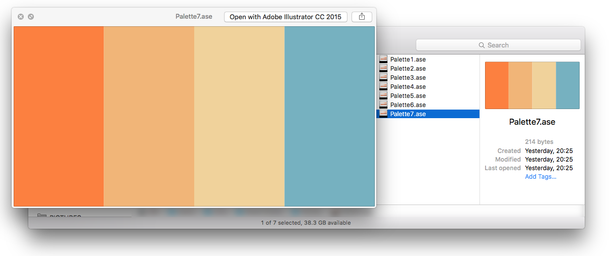 Preview Adobe ASE Color Swatches generated with Adobe Photoshop, Adobe Illustrator, Adobe Color CC, Spectrum, COLOURlovers, Prisma, among many others.